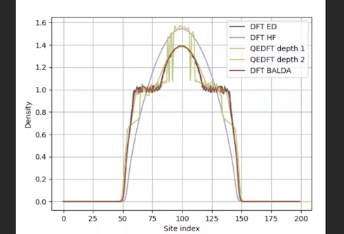The ground state density of the 1 × 200 Fermi Hubbard model for U/t = 10 and at quarter filling within a confining quadratic potential using a QEDFT functional generated on a 1 × 12 homogeneous Fermi-Hubbard system.