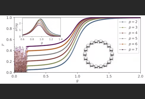 Results of phase transition detection for the 1D transverse-field Ising mode - fidelity between optimised states and the true ground states, evaluated across varying p and g values, with the system size fixed at n = 18.